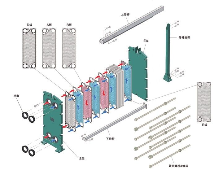 板式热交换器是由一组波纹金属板组成,上有四个角孔,供传热的两种液体通过。金属板片安装在一个侧面有固定板和活动压紧板的框架内,并用夹紧螺栓夹紧。板片上装有密封垫片,将流体通道密封,并且引导流体交替地流至各自的通通内,形成热交换。流体的流量,物理性质,压力降和温度差决定了板片的数量和尺寸。板片的波纹不仅提高了湍流程度并且形成许多支撑点,足以承受介质间的压力差,金属板和活动压紧板悬挂在上导杆上并由下导杆定位,而杆端则固定在支撑柱上,但如果其中一种液体或两种液体在换热器内不止通过一次,则接口应开在固定板和活动压紧板上,在大多数场合使用单程,所有管路都连接固定压板上,检查拆鞋打开换热器,不必拆卸管道。